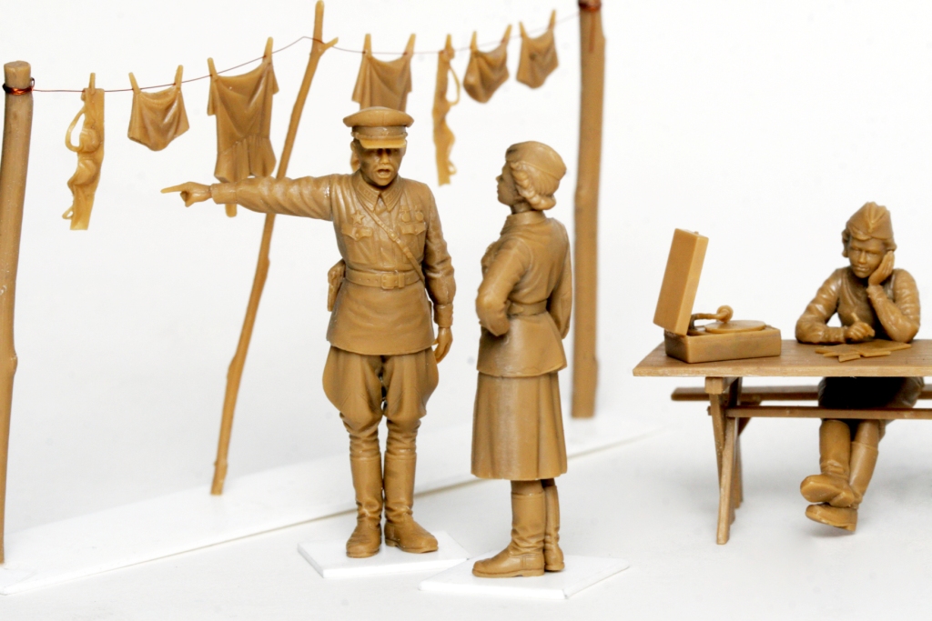 Стол, скамейка, самовар, патефон, вешалка с бельём и другие подробности.