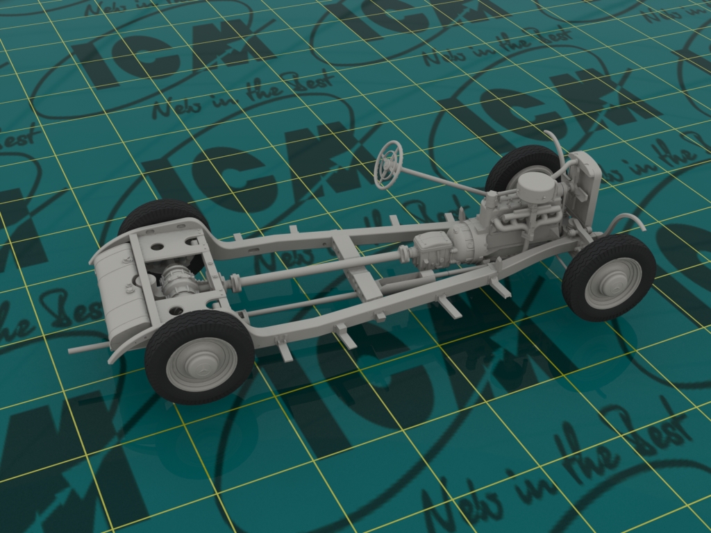 Детализированная подвеска, сборная несущая рама, проработанные трансмиссия, задний мост, кардан, рычаги, амортизаторы, выхлоп выполнен отдельной деталью.