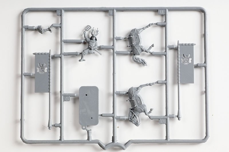 В наборе три пешие и одна конная фигура. Позы выглядят очень реалистично, а проработка мелких деталей просто на высоте. Фигуры изготовлены с использованием технологии 3D-проектирования. В коробке, помимо фигурок, вы найдете подставки, флаги и два комплекта декалей для кланов Ода и Такеда.
